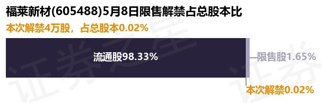 证券之星消息,根据市场公开信息整理,福莱新材(605488)于5月8日将有4.0万股限售股份解禁,为公司股权激励限售股份,占公司总股本0.02%。(本次数据根据历史公告整理得出,实际情况以上市公司最新公告为准)最近一年内,该股累计解禁1.31亿股,占总股本的65.08%。本次解禁后免息炒股配资平台查询,公司还有333.58万股限售股份,占总股本1.65%。具体如下图所示: